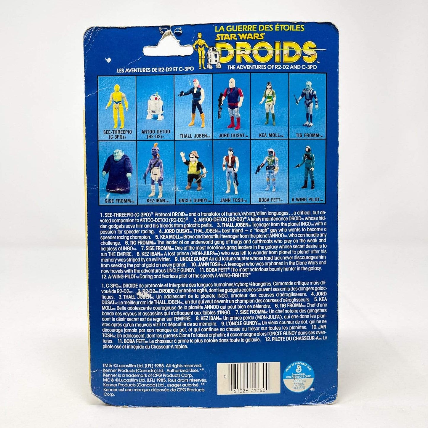 Jord Dusat mint and sealed on card (MOC) on a Kenner Canada DROIDS cardback.