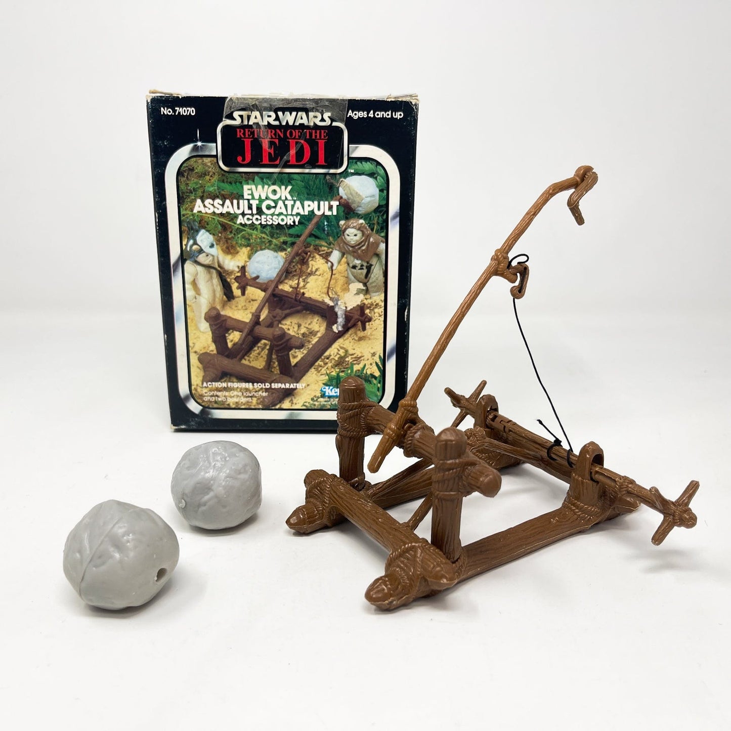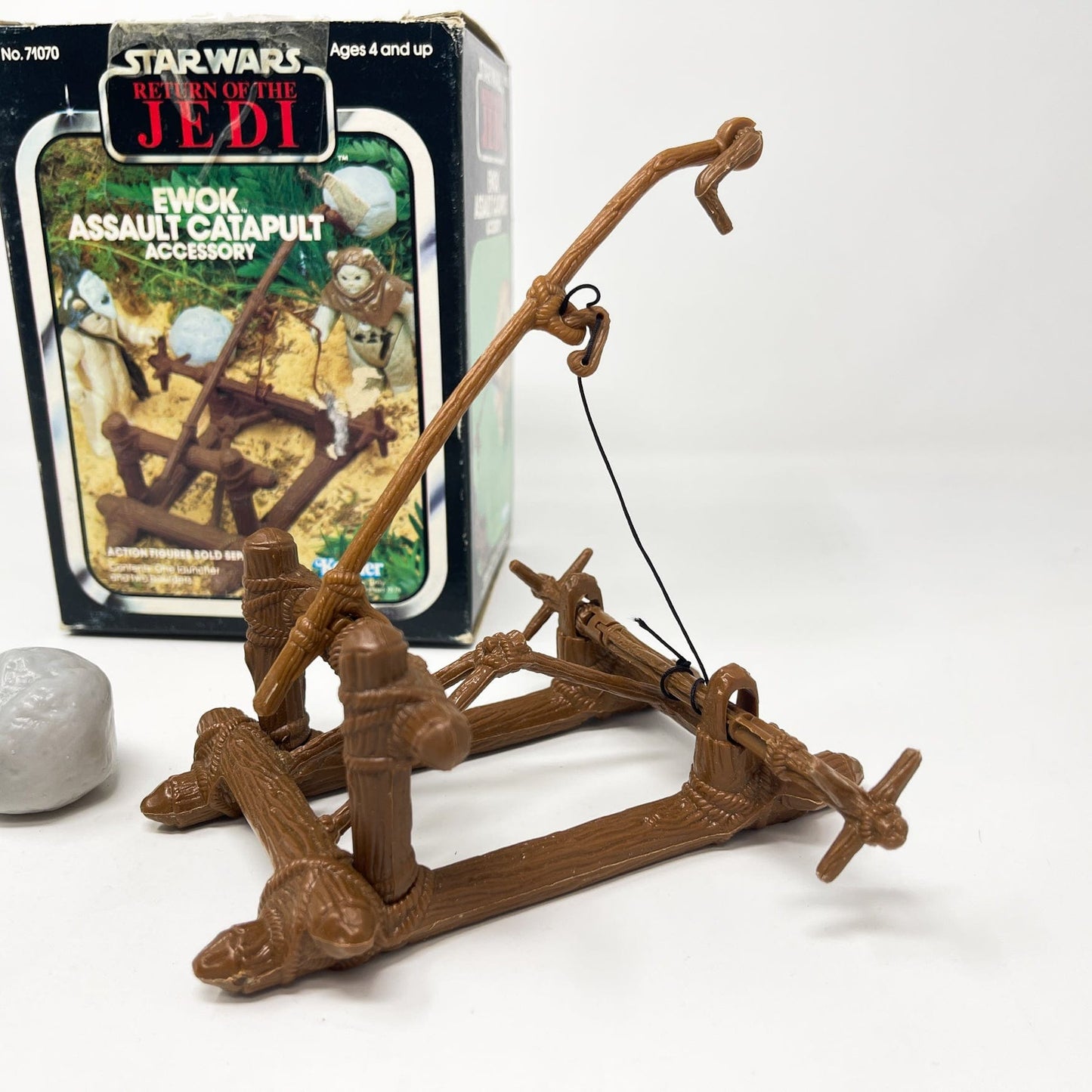 Ewok Catapult by Kenner. Relive the excitement of the Battle of Endor from Return of the Jedi. Complete with all parts including two boulders, original string and the the two tiny parts.
