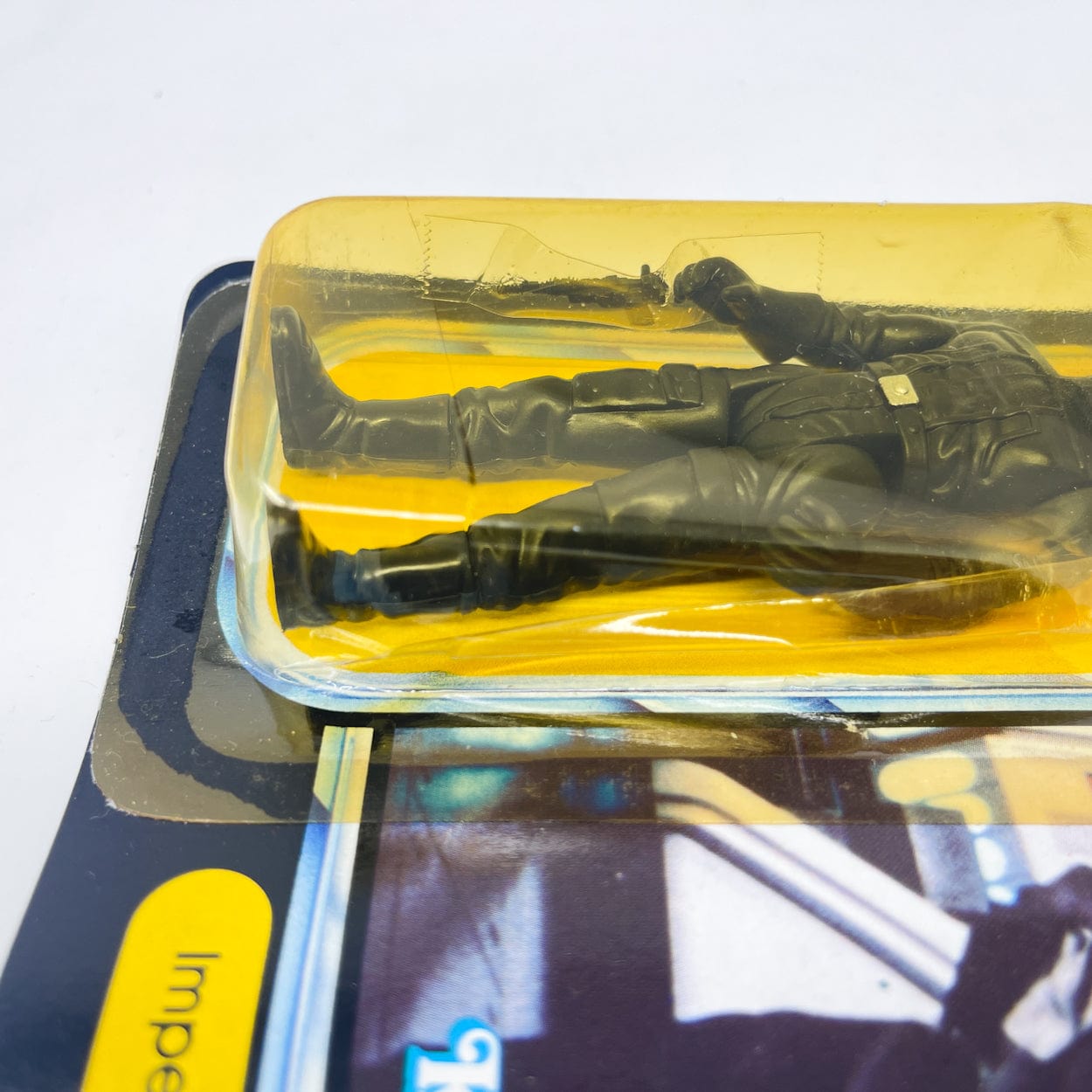 Bubble has a crack across the front in the lower portion. Figure can't be removed without making it worse and blaster is still attached by tape to the side (guaranteed original). There's also a crushing on the top of the bubble.
