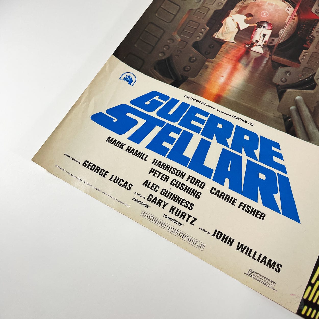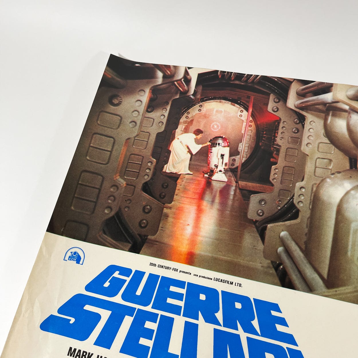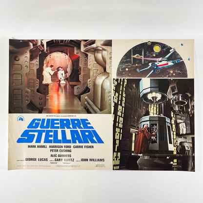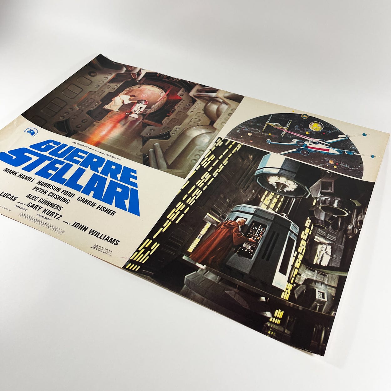 These photobustas are unused (they have no tape or pin holes) which is quite rare. There is wear from over 40 years of storage though, please see detailed pictures. These were made for the original release of Star Wars in Italy, probably in 1978. I love that Guerre Stellari logo!