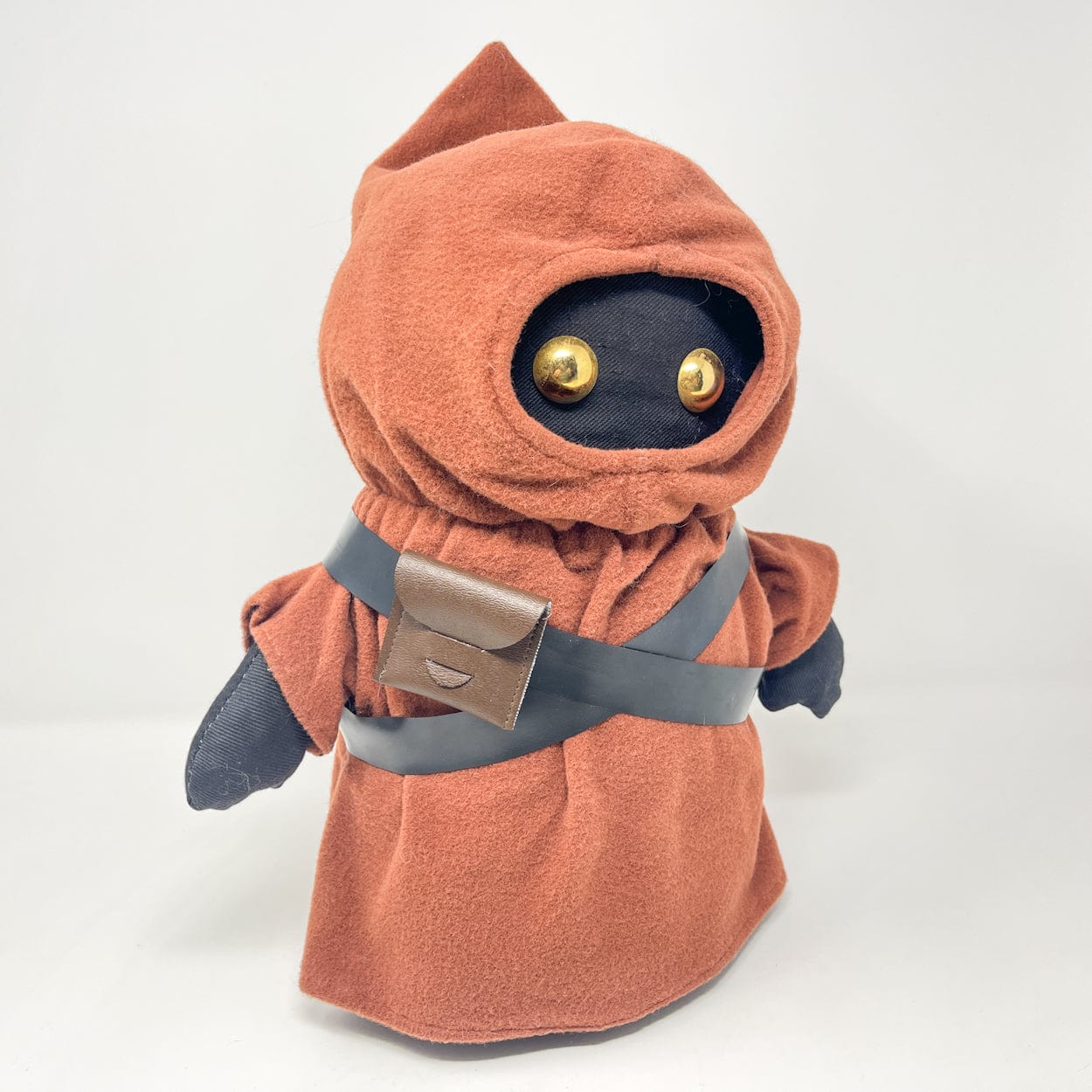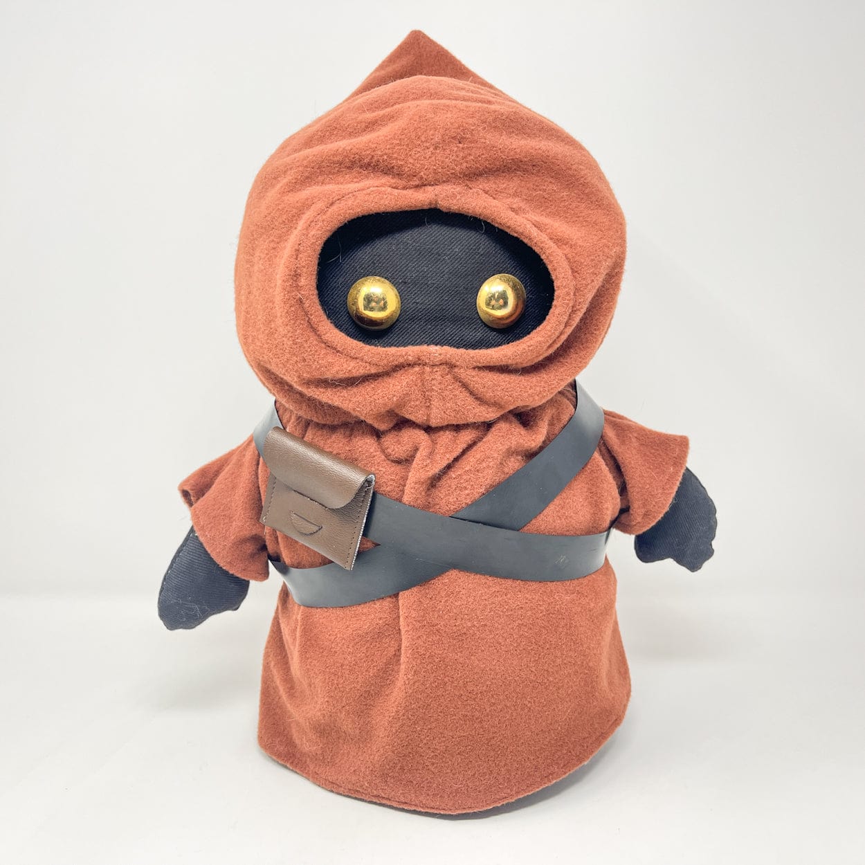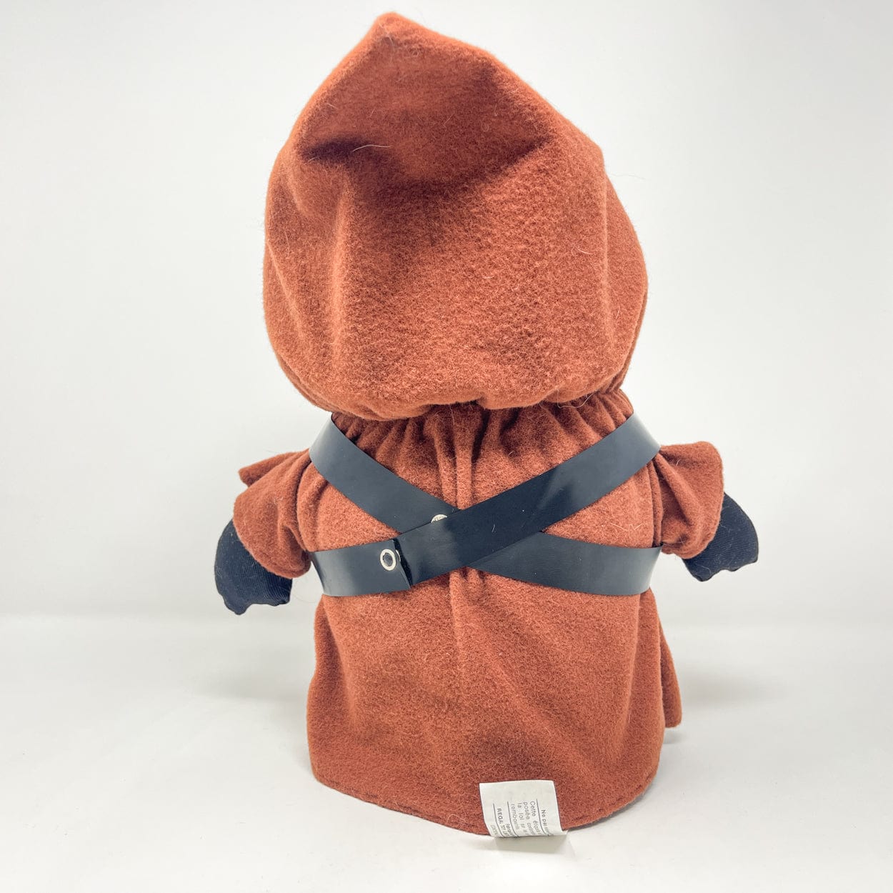 Produced exclusively for the Canadian market by Regal Toys in 1978, this large Jawa plush originated from a Kenner prototype concept that was never released in the United States. Standing approximately 15 inches tall, it features a soft poly-filled body, felt cloak, gold eyes, and a functional squeaker in the left hand. Includes both vinyl bandoliers and a fabric satchel.