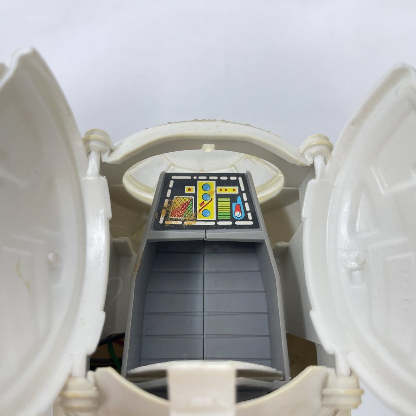 Very nice condition. Battery compartment is clean, as is the cockpit. Wing hold in place tightly and it stands with no problem. Eject button works to release wings.